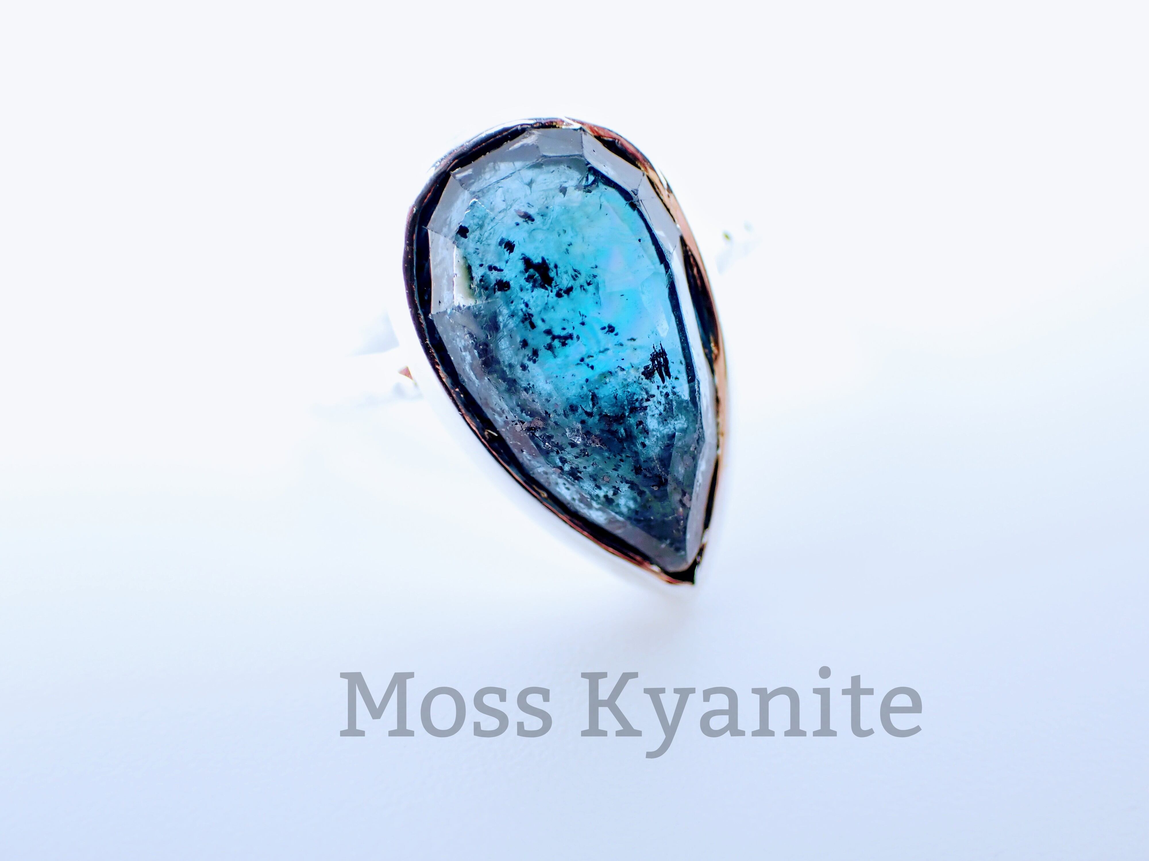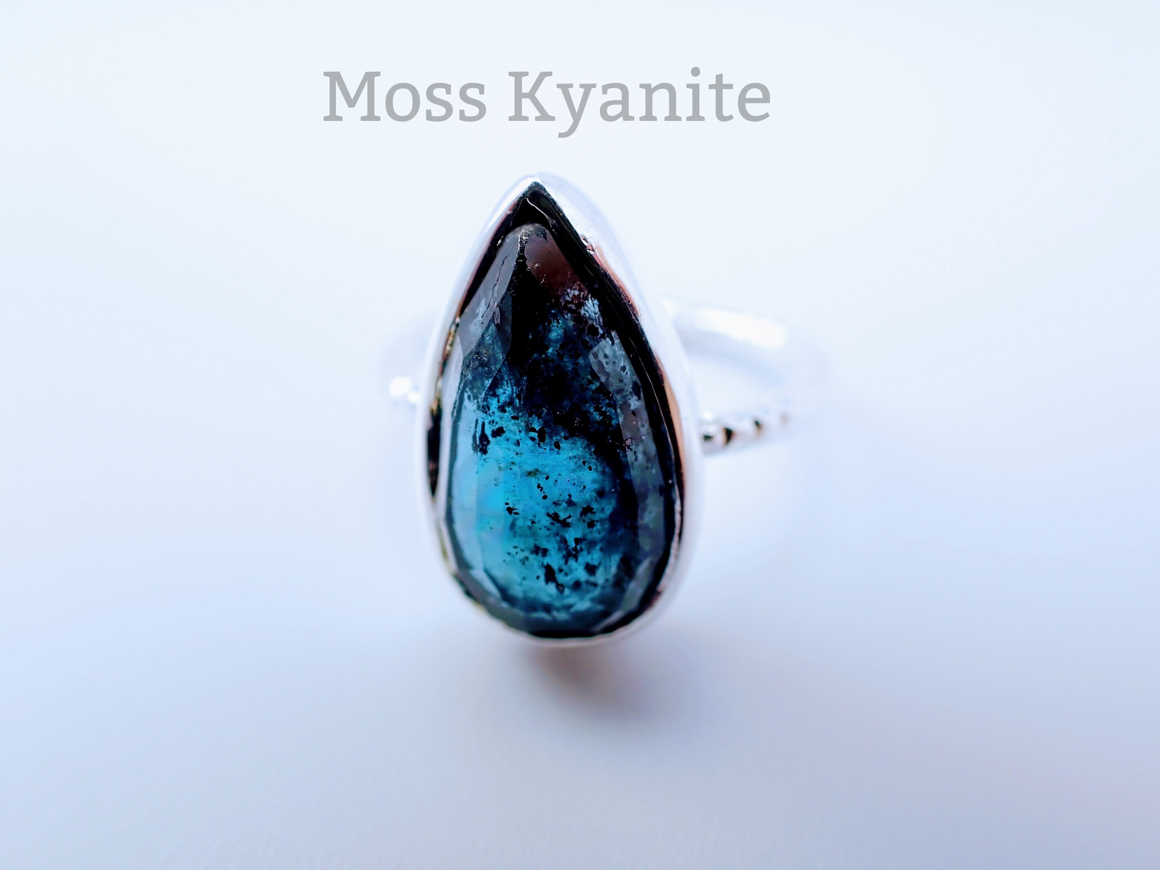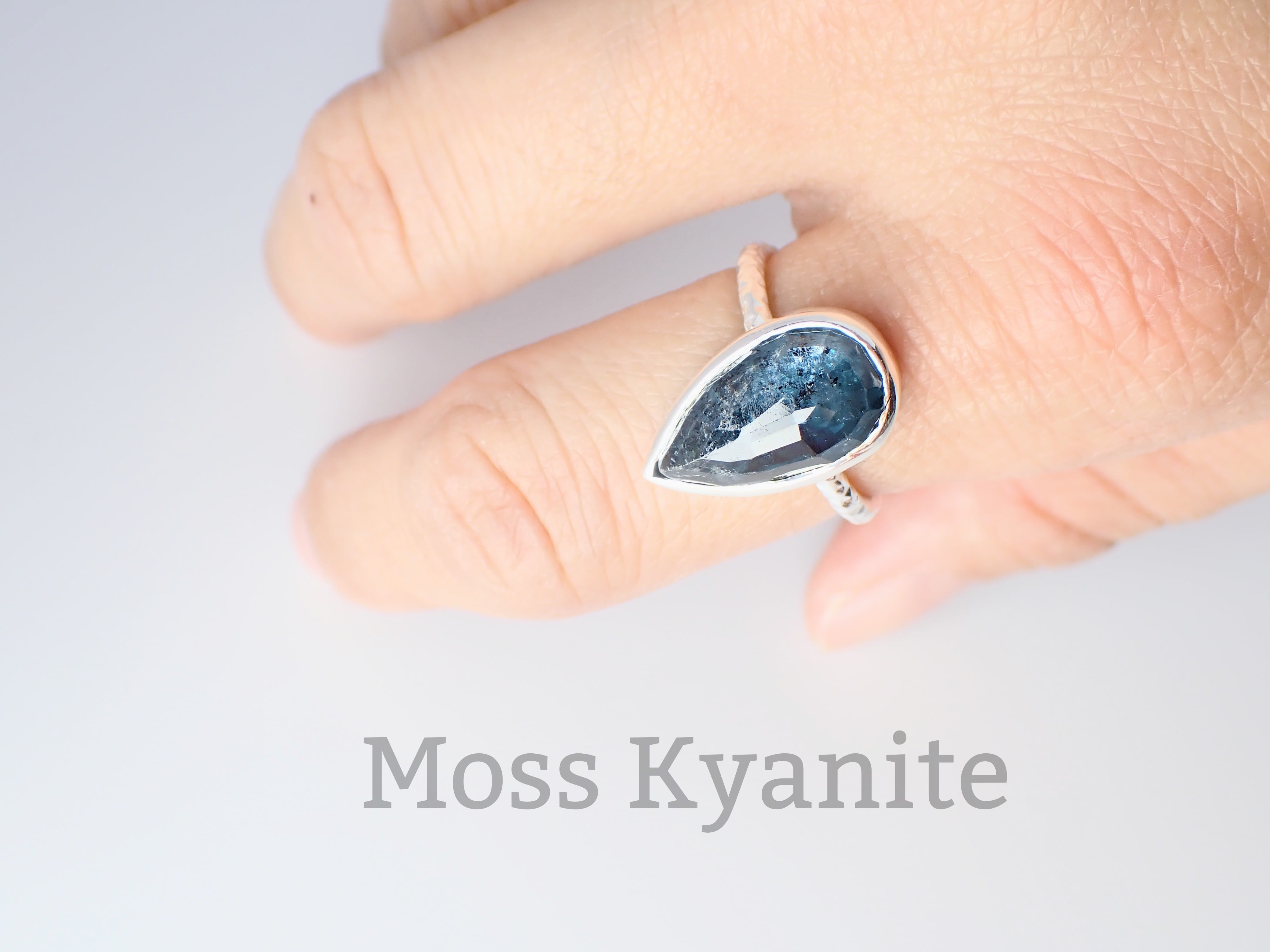 イスタンブールのジュエリーデザイナーが作った世界でたったひとつのsilver925の希少なしずく型モスカイヤナイト。表面にカットが施されている煌めくミッドナイトブルーのモスカイヤナイトリング★