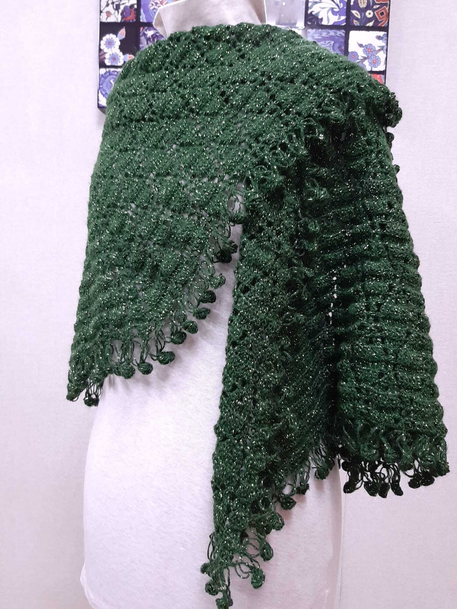 お色は、濃いグリーンラメを用いた肩掛けストールマフラーになっています。