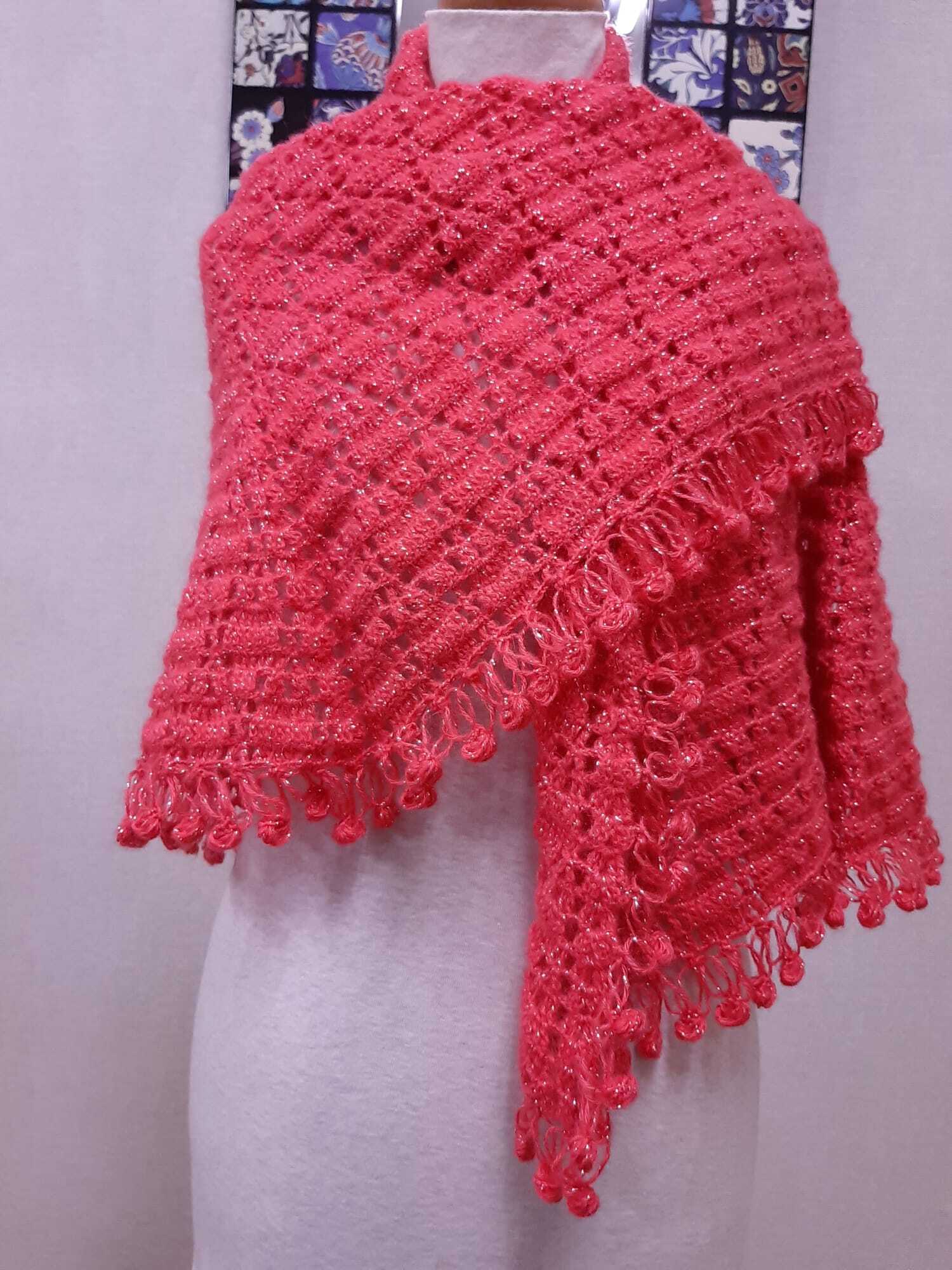 お色は濃いカーネーションピンクのラメ入り毛糸を用いた肩掛けストールマフラーになっています。