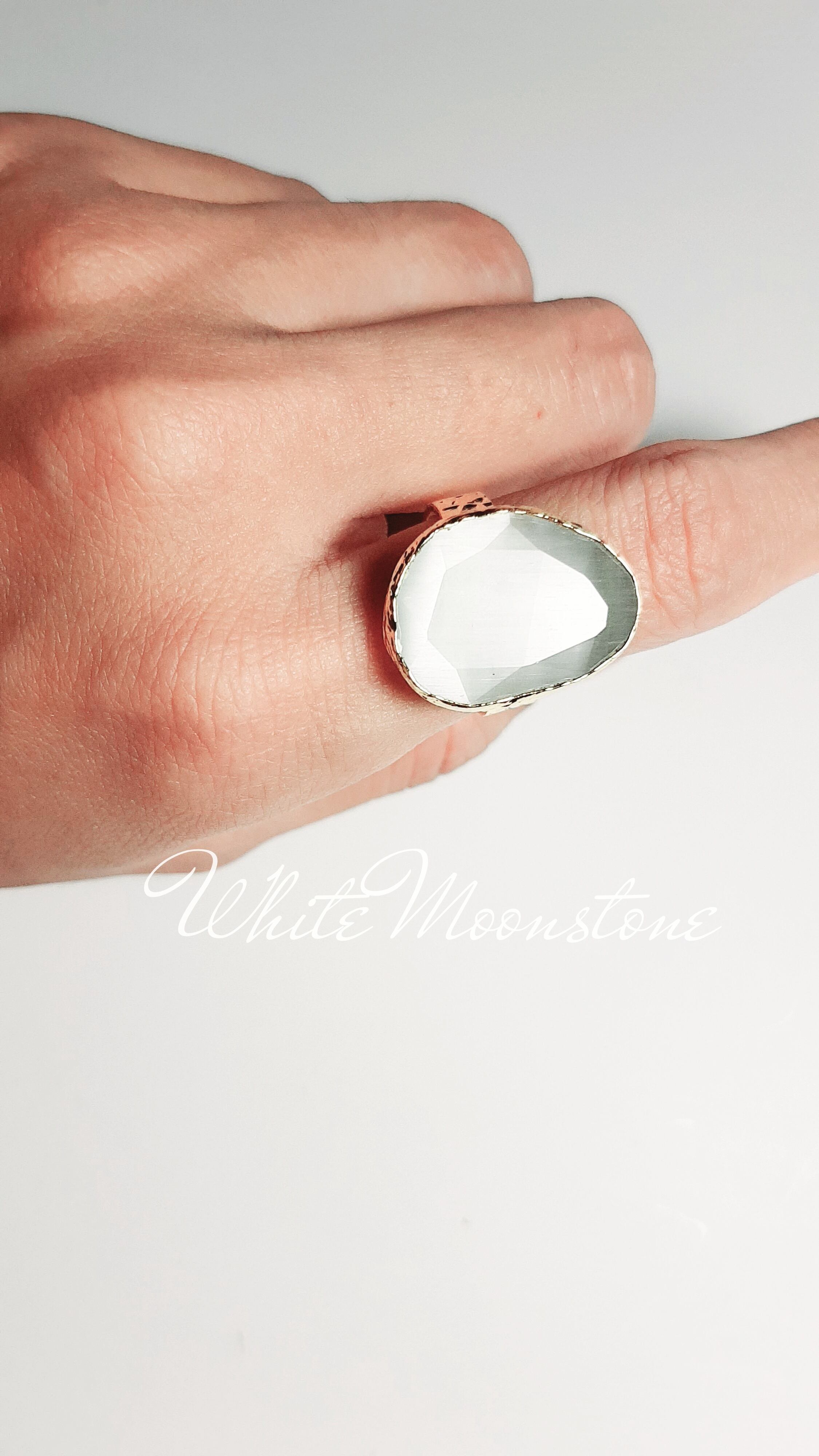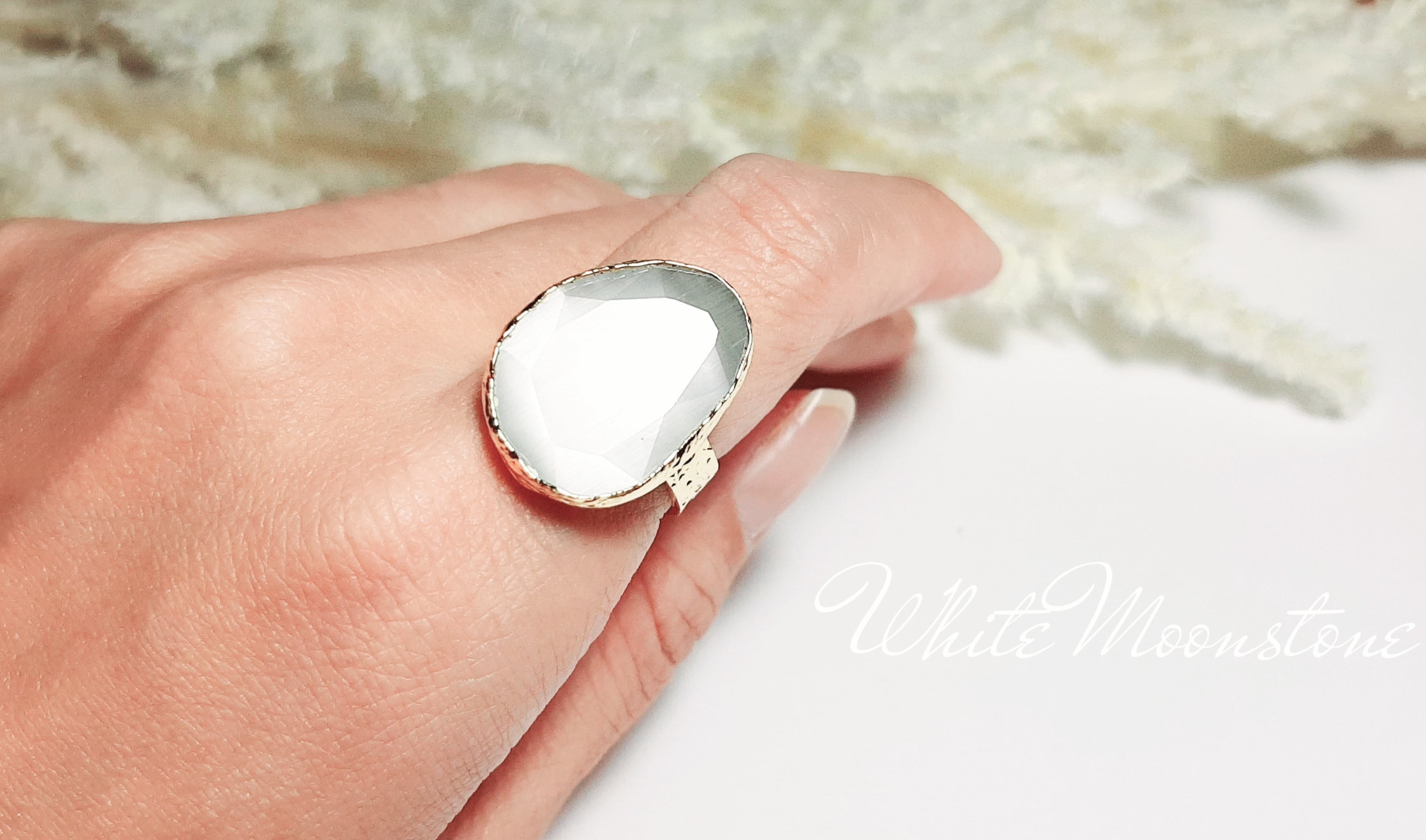 『White Moonstone』の素敵な1粒リングです。大きめで角度を変えると石がすごく綺麗すぎるくらい綺麗です。