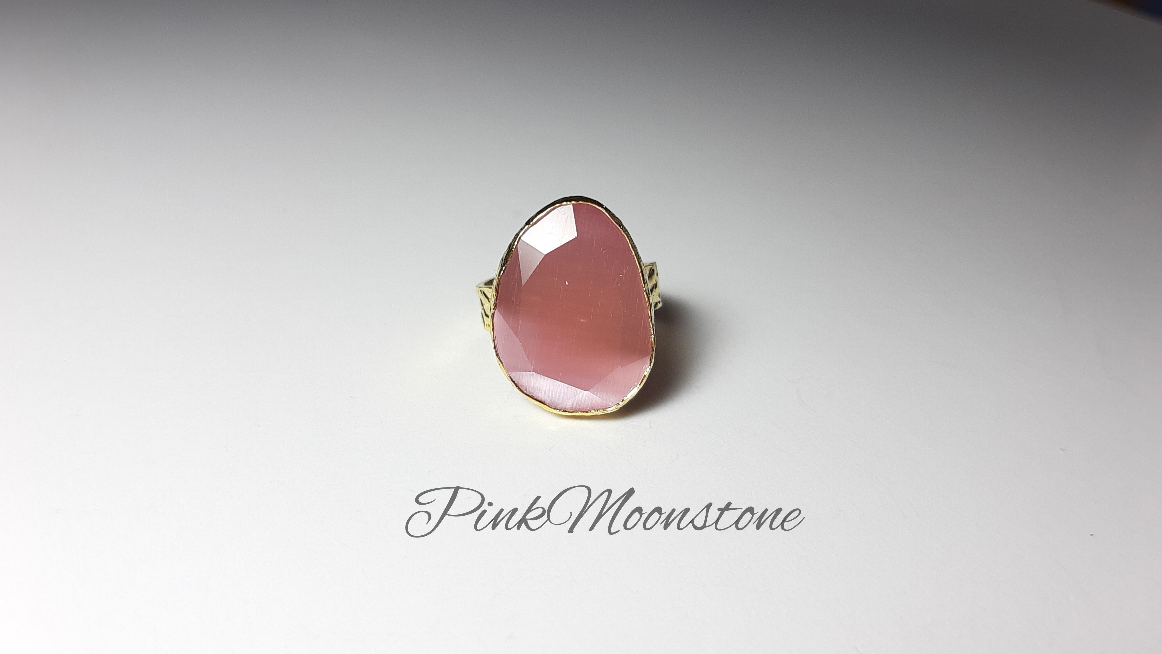 『Peach Moonstone』の素敵な1粒リングです。大きめで角度を変えると石がすごく綺麗すぎるくらい綺麗です。