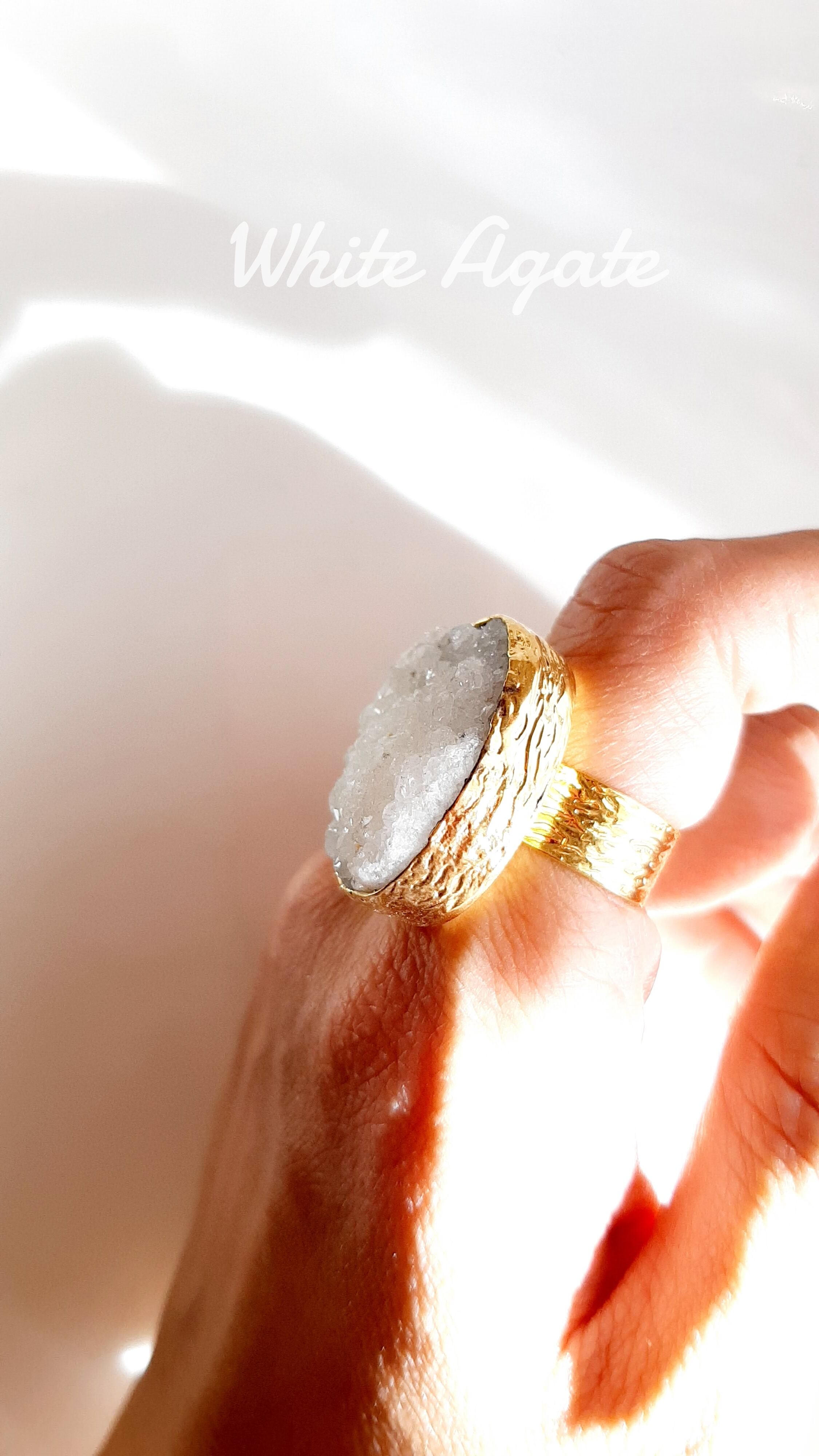 『大きな煌めくホワイトアゲート』の世界でひとつの天然石リング