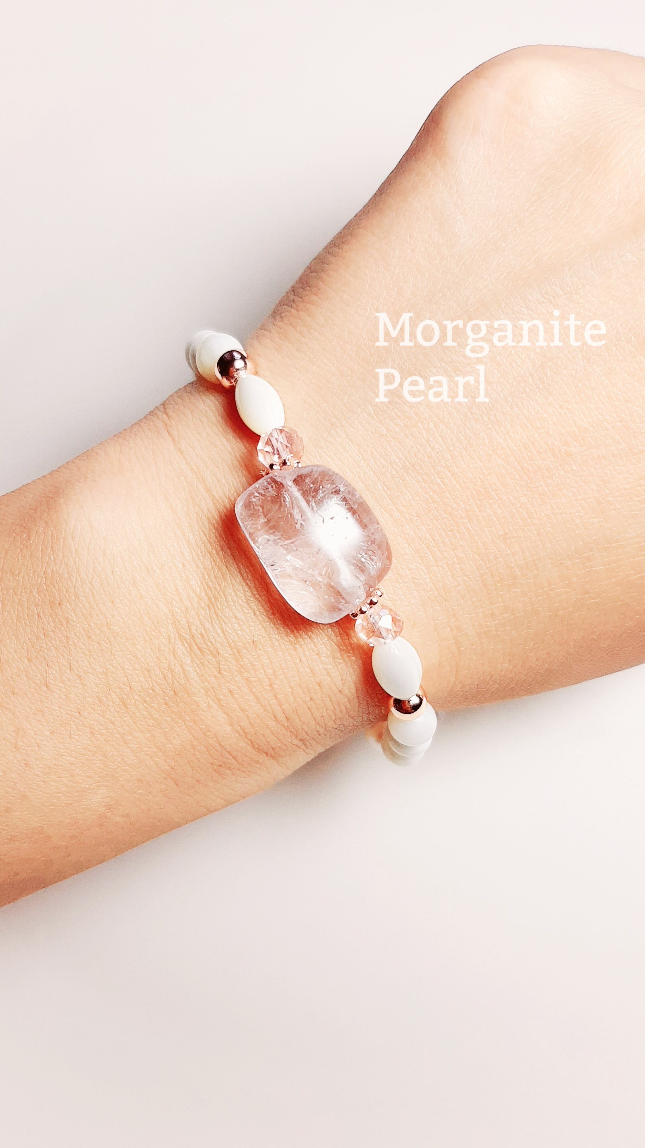 大きめモルガナイトとさまざまなパールを混ぜて創った世界でひとつのブレスレット。