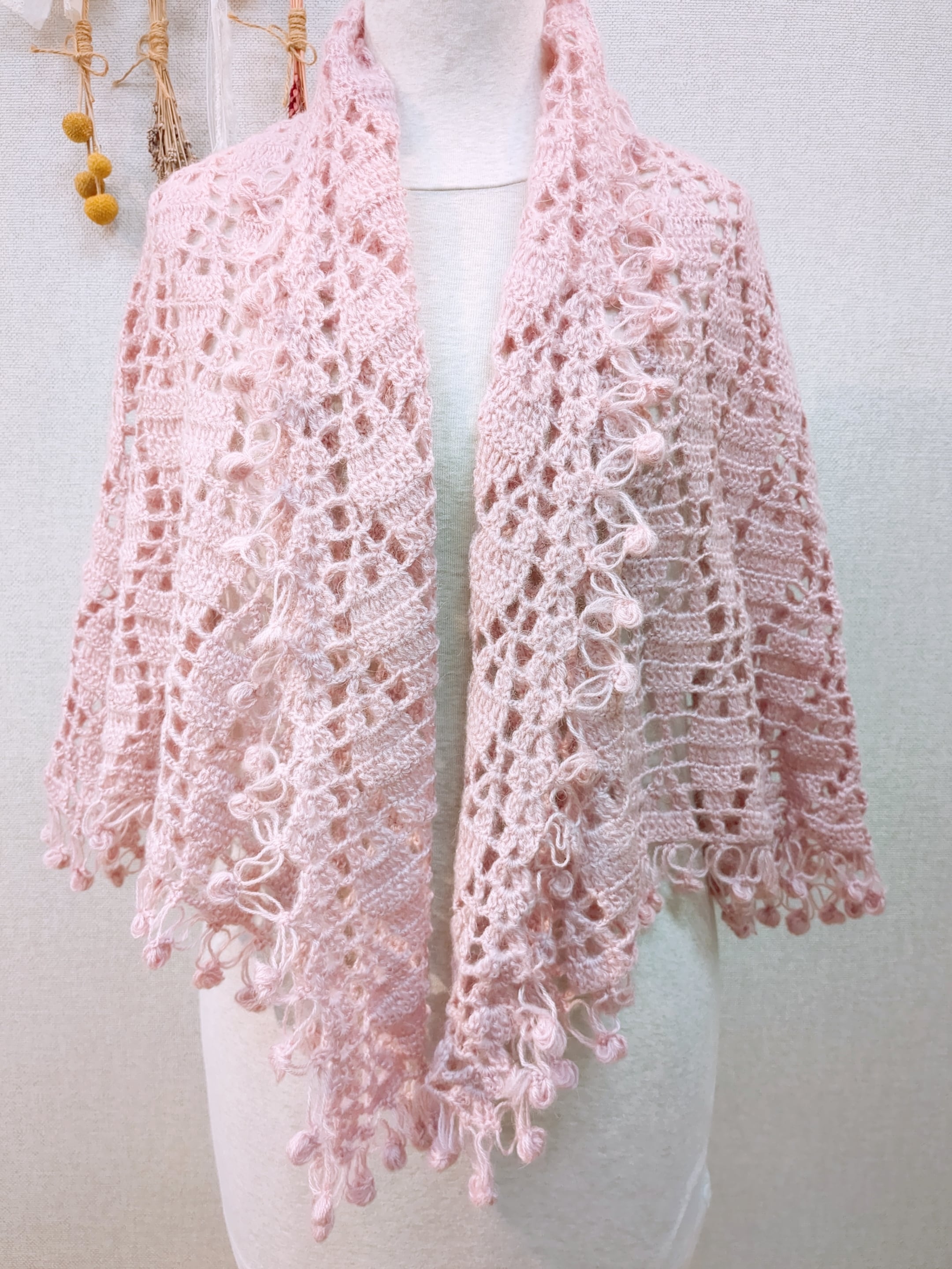 お色はミルキーピンクを用いた肩掛けストールマフラーになっています。