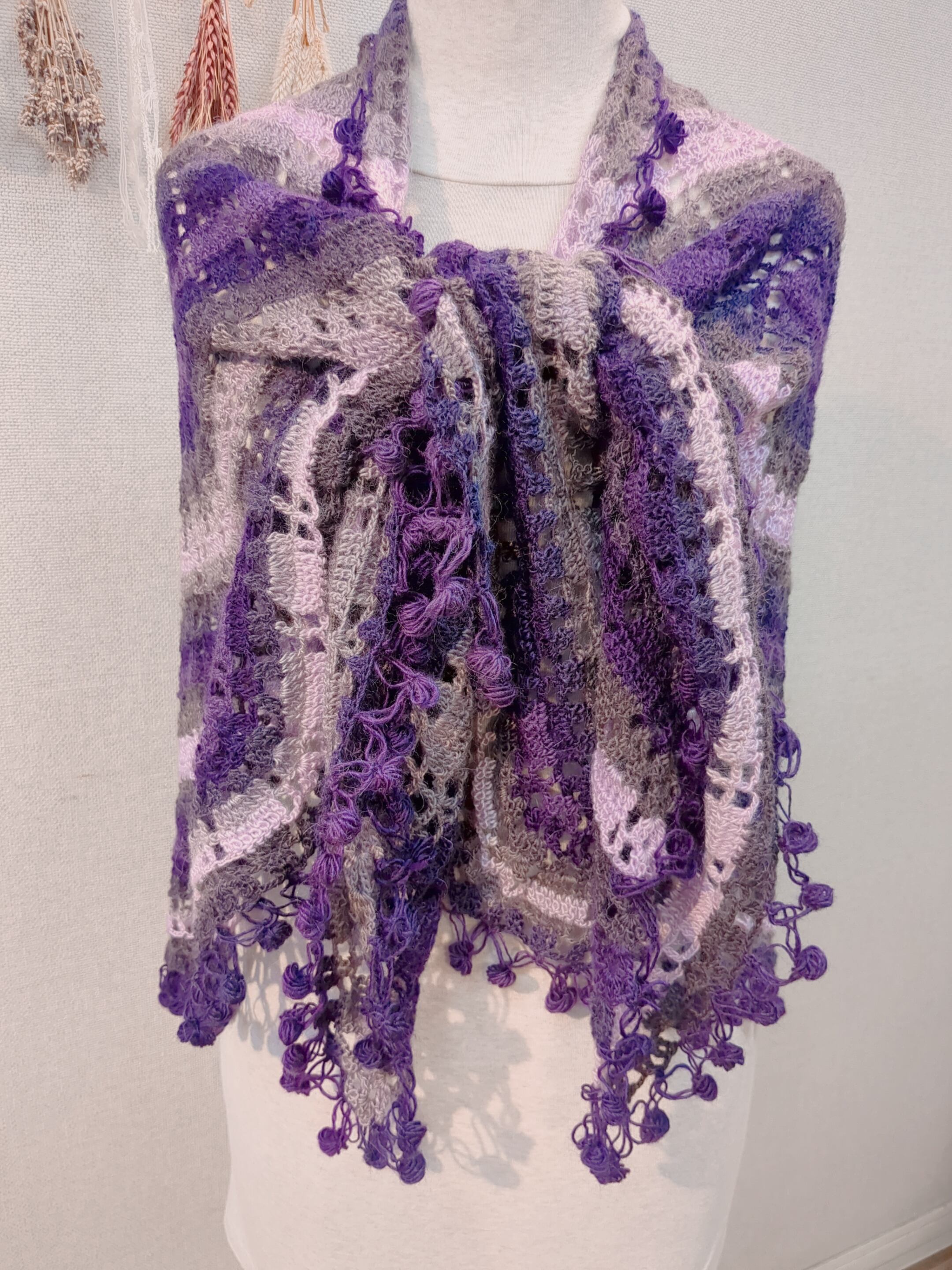 お色はブルーベリーカラーとグレーカラーを用いた肩掛けストールマフラーになっています。