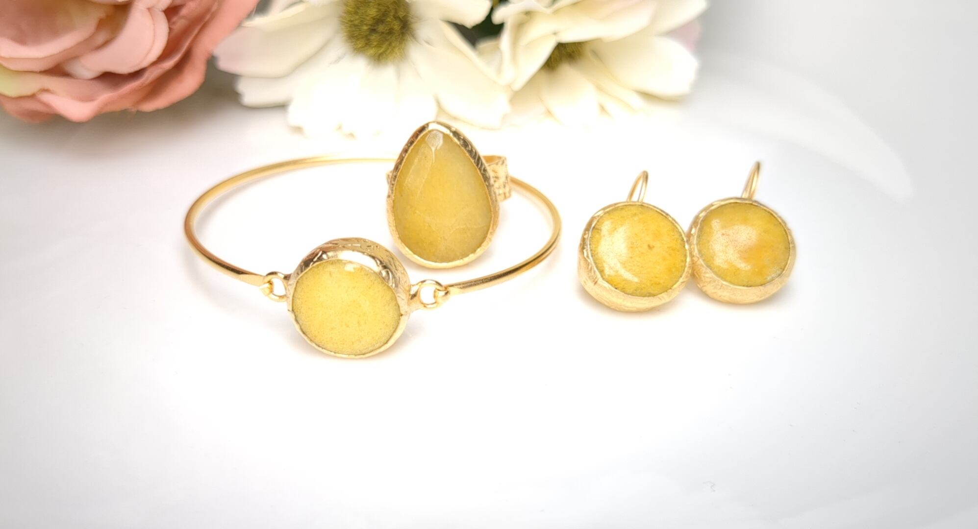 アラゴナイト一粒天然石のドロップ型リングと丸形ブレスレットと丸形ピアスの3点セット。