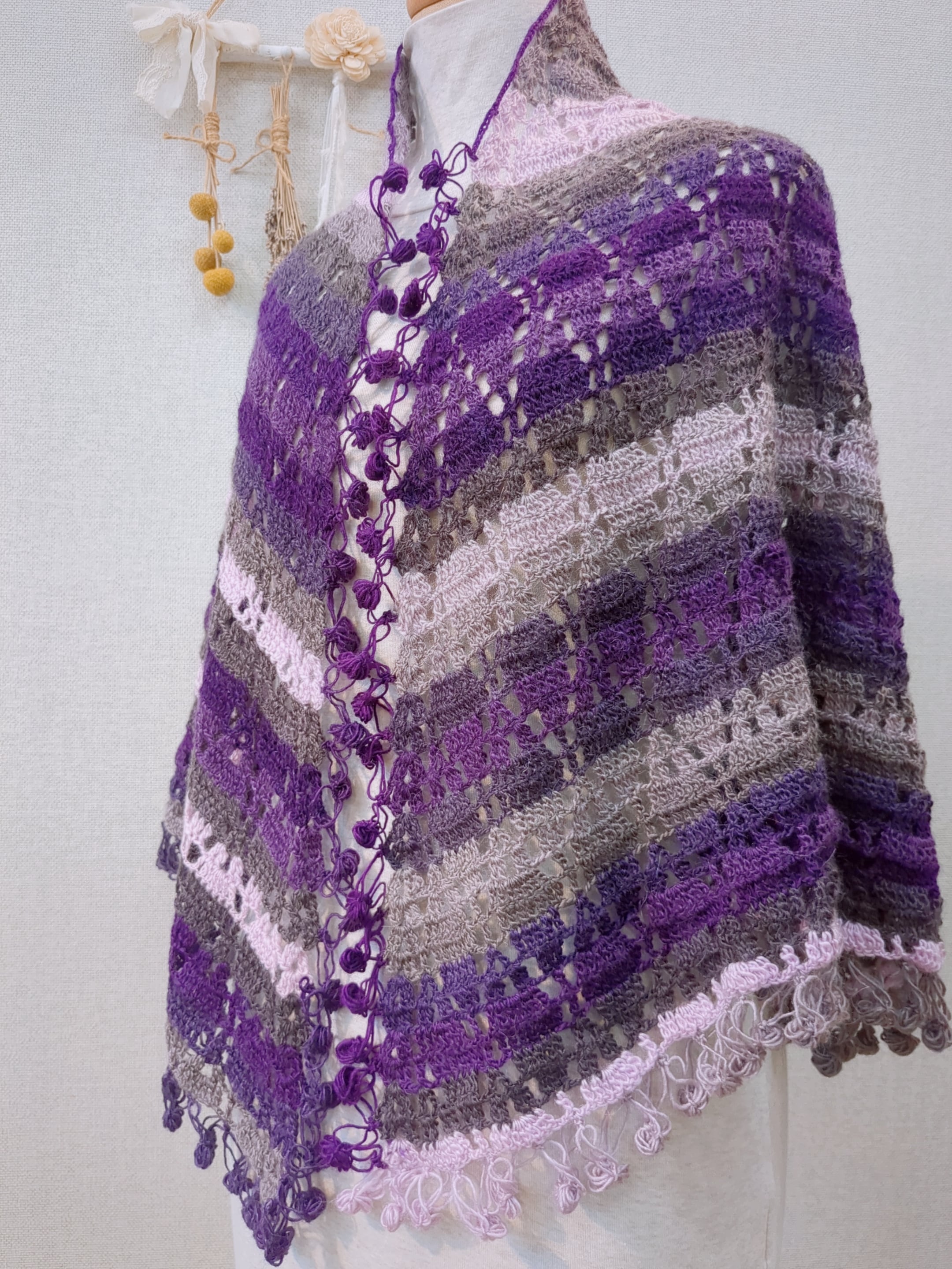 お色はパープルベリーカラーとグレーカラーを用いた肩掛けストールマフラーになっています。