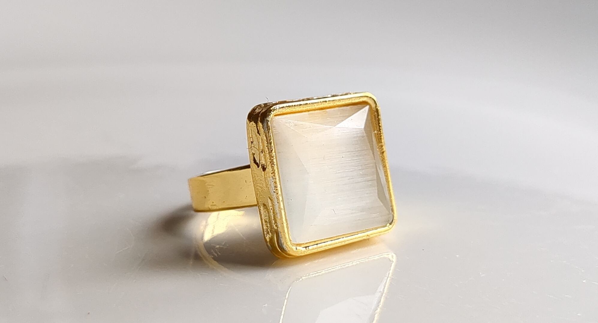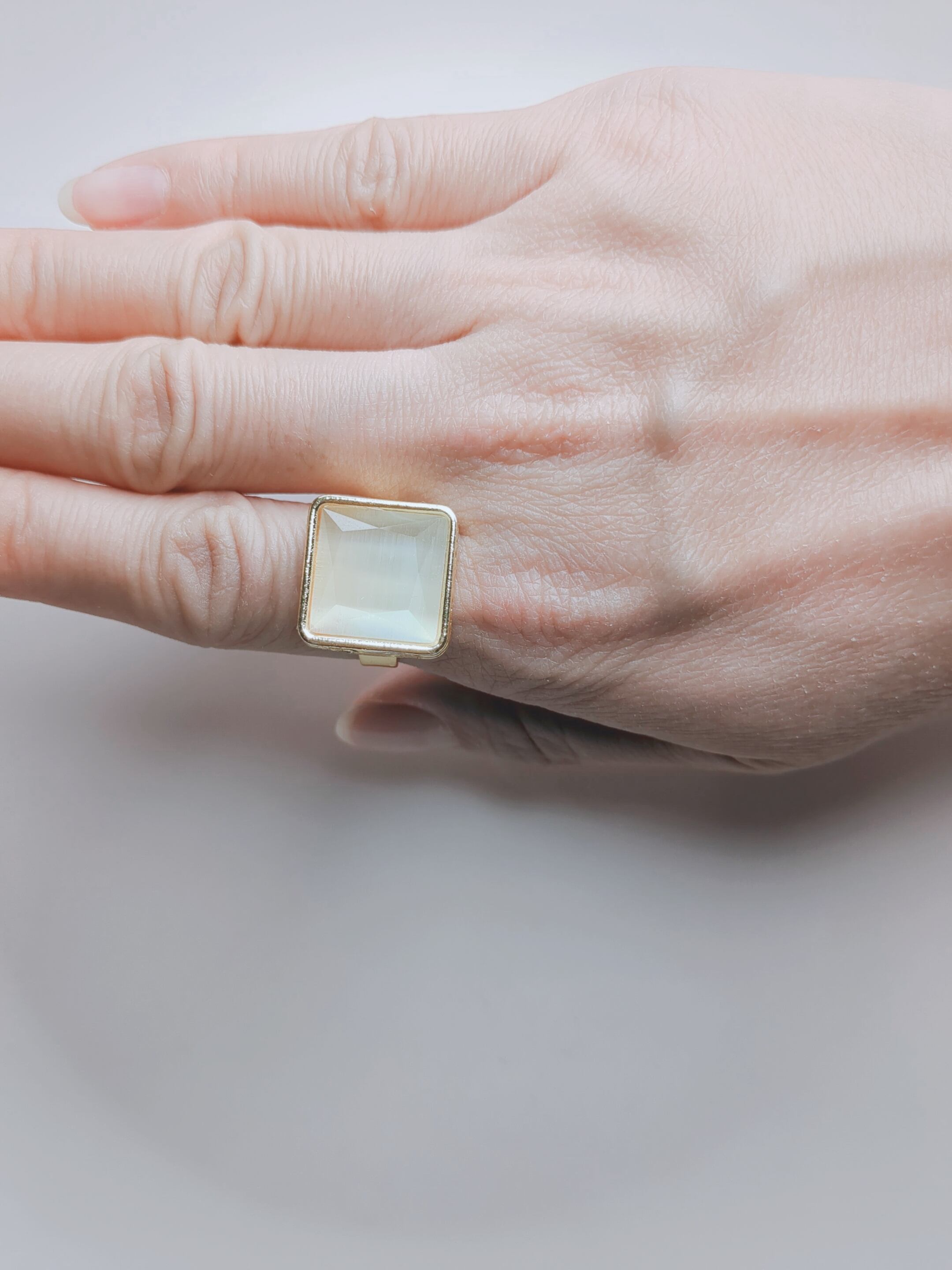 『雪のようなホワイトムーンストーン』の素敵な1粒リングです。お洒落なスクエアサイズがさらにお洒落さを増します。角度を変えると、石がすごく綺麗すぎるくらい綺麗です。