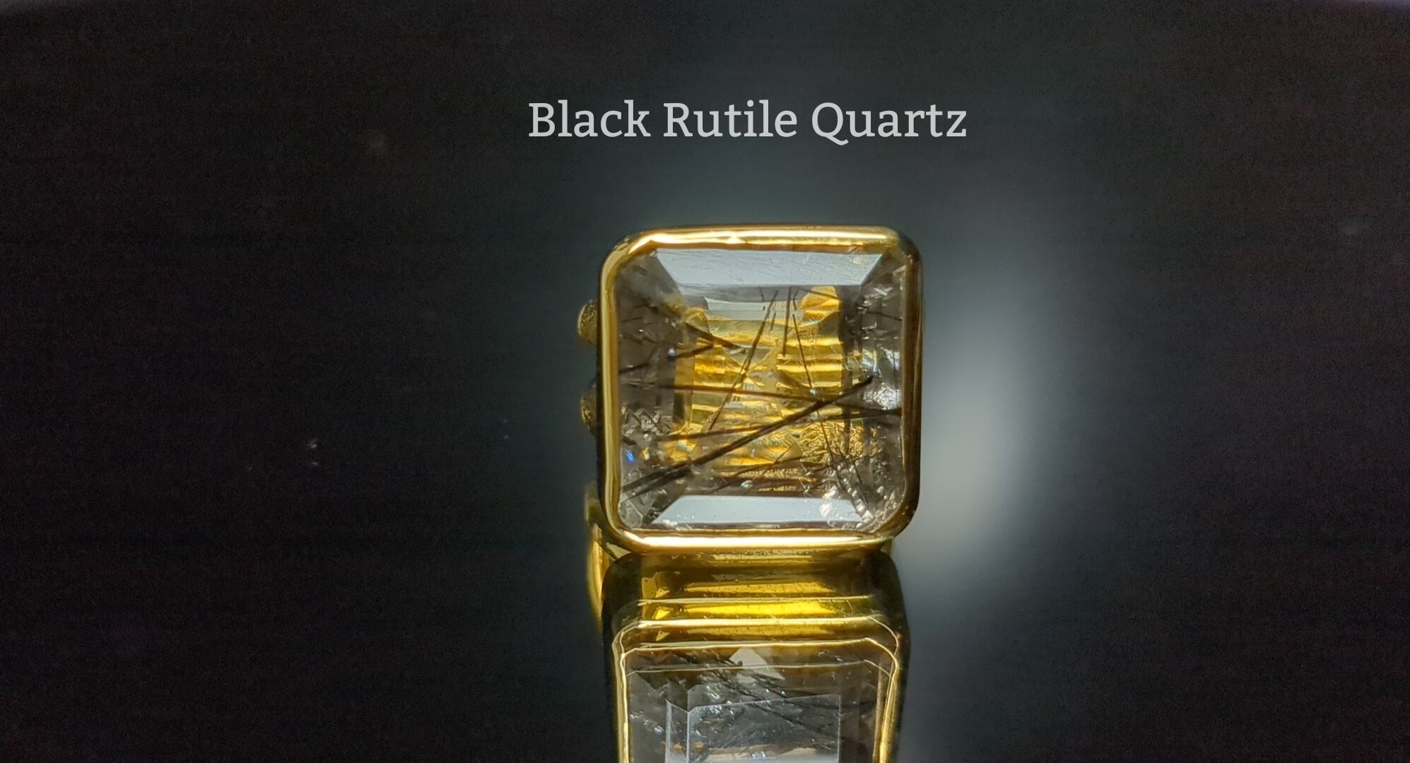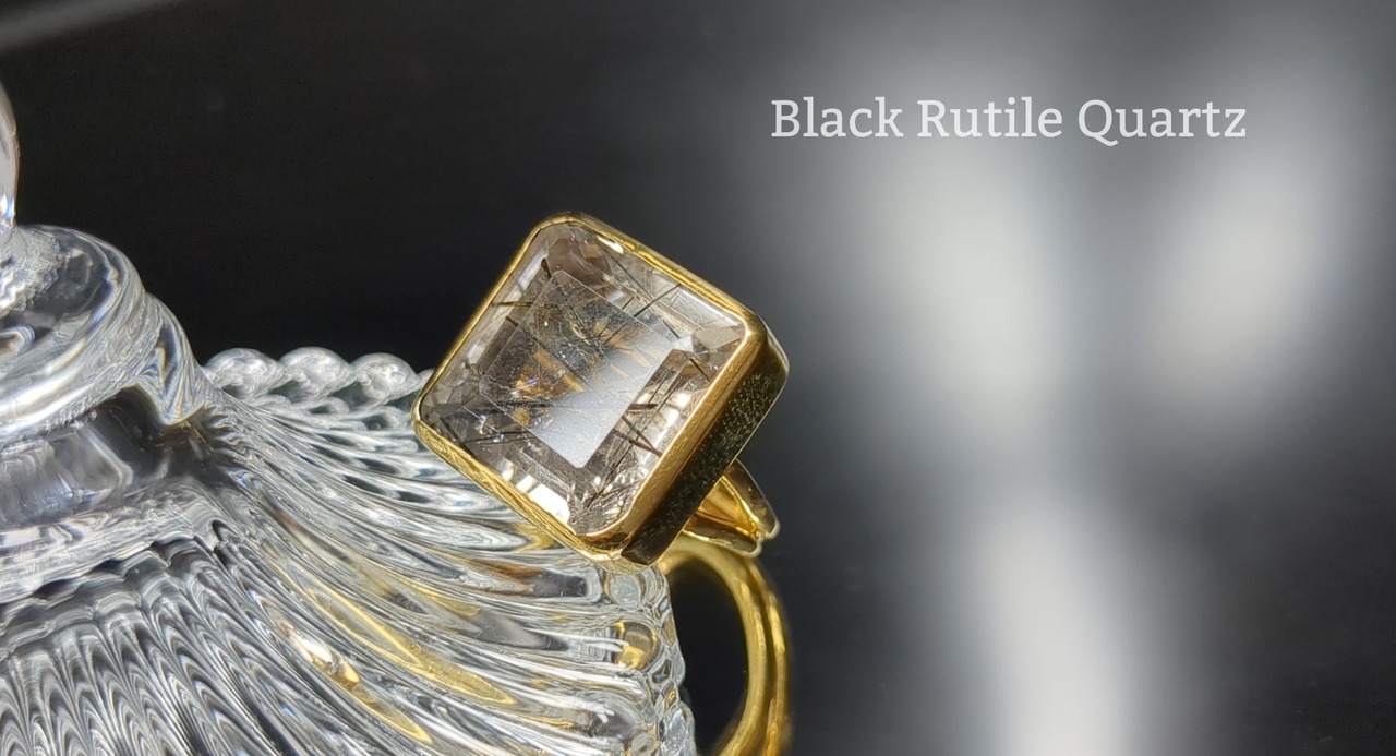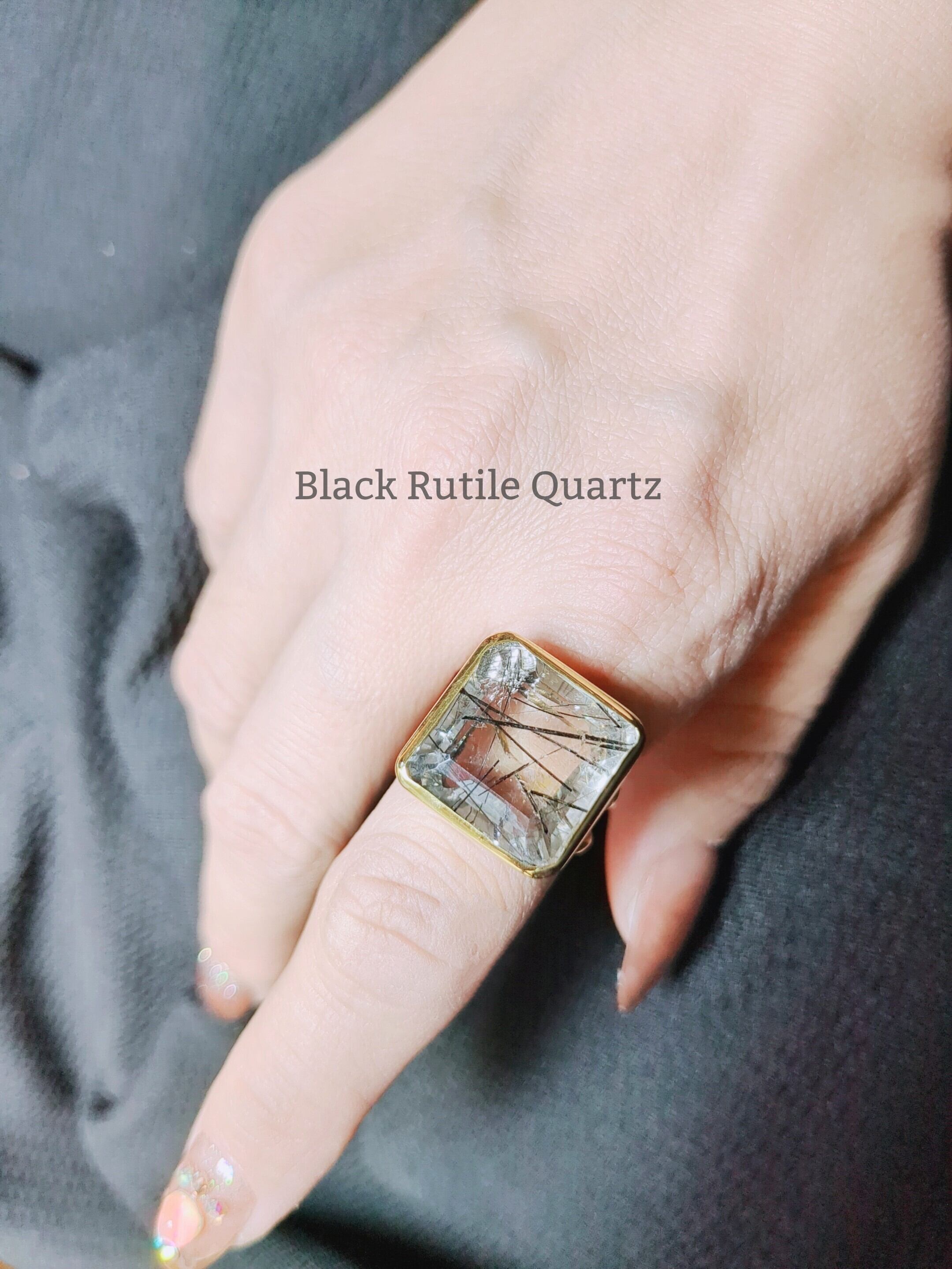 最新作 虹のキラキラ入り「ブラックルチルクォーツ」のスクエア天然石リング