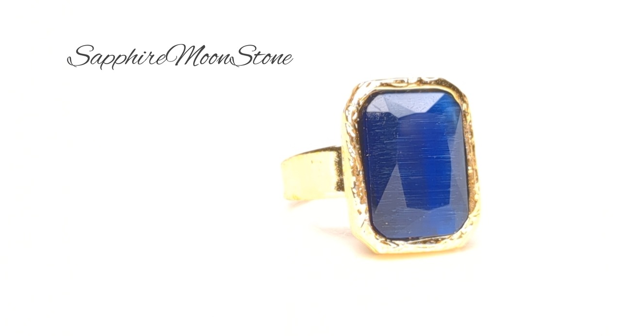 『サファイアムーンストーン』の素敵な1粒リングです。お洒落なスクエアサイズがさらにお洒落さを増します。角度を変えると、石がすごく綺麗すぎるくらい綺麗です。